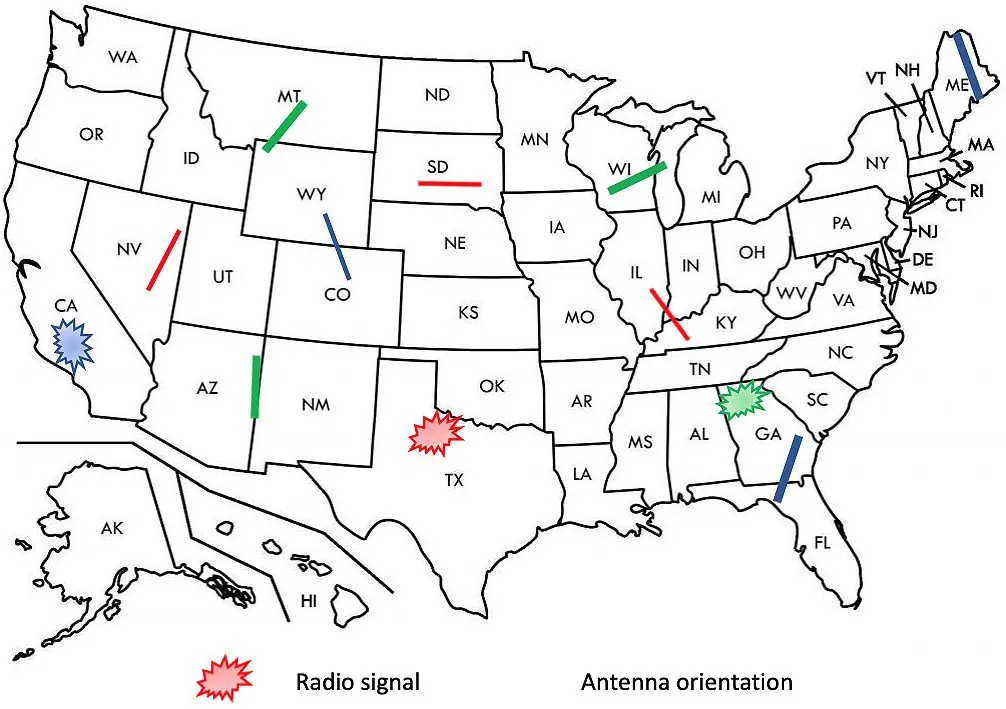 To improve reception of SW BANDS (aka HF BANDs), plug the SW antenna (a 15.6 ft. black wire) into the correct socket on the left side of the radio. Extend the antenna as long as possible. You can attach the clip of the SW antenna holder to a curtain rod, curtain, or tree. Be sure the antenna is still attached to the holder; you may need to apply a small piece of electrical tape to keep it attached. Attempt to orient the wire perpendicular to the direction of the SW radio signal. CORAC’s primary locations for the broadcast net are in Georgia, Texas, and California. If you are located North of Georgia, the antenna should be oriented horizontally in a West to East direction. Three colored examples are below: red radio signal with red antenna orientation, blue with blue and green with green. Notice how orientation must change for antenna to pick up the radio signal. The location of the transmitted signal determines the antenna orientation. By nature, SW radio signals are difficult to hear. However, they can be heard. Bandwidth selection can improve the sound.