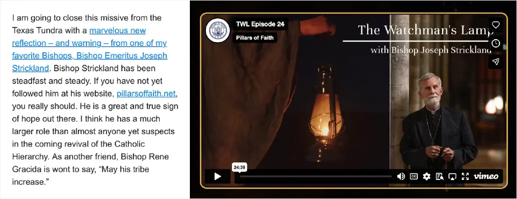 I was heartened to read in Charlie’s latest blog post, Thoughts From The Texas Tundra, an endorsement of Bishop Strickland’s recent podcast, “The Watchman At The Altar.” Bishop Strickland is one of the few (the only in America) bishops willing to speak about the Church’s crisis. All the other bishops blithely walk on, as though nothing is happening that need concern our pretty little heads.
